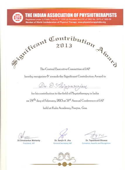 - One of the Judge for Post Graduate Paper Presentation on Advanced/Innovative Physiotherapy at the at 51st National Conference conducted by Indian Association of Physiotherapists at GOA