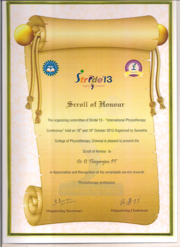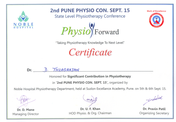 - Paper presented in National Entrepreneurs Network – E week conducted by Sri Ramachandra Medical College & Research Centre, Sri Ramachandra University – Chennai during Feb 2012 on “REDEFINING THE SUCCESS – PHYSIOS OUTLOOK”.